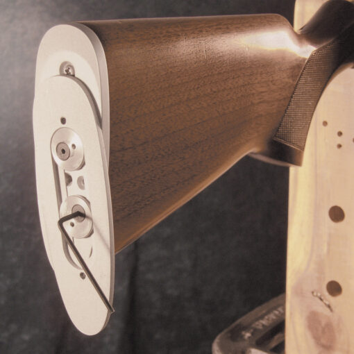 The same style adjustable pad plate as used on our GraCoil system. Two eccentric cams provide a nearly unlimited range of adjustments for height, canter and rotation. Locks securely to hold your settings. Fifteen mounting holes let you position the recoil pad exactly right, so you get the best possible gun fit.